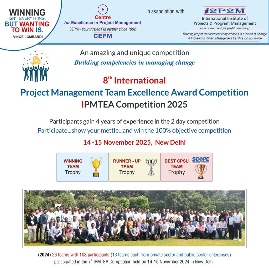 The globally unique 7th International Project Management Team Excellence Award (I-PMTEA) 2024 competition concluded on November 15, 2024 with astounding success. There were 103 participants in 26 teams from Government, public and private sector companies. The competition ranking is 100% objective being based on the total marks obtained by each team in two real time computer simulations from Prendo, UK on Managing Stakeholders and Project Leadership. Each team’s performance is assessed in UK. Same simulations are also being used by the top 20 business schools and global companies.